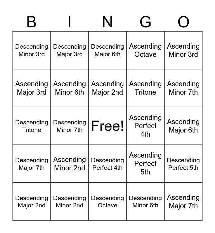 This bingo card has a free space and 24 words: Ascending Minor 2nd, Descending Minor 2nd, Ascending Major 2nd, Descending Major 2nd, Ascending Minor 3rd, Descending Minor 3rd, Ascending Major 3rd, Descending Major 3rd, Ascending Perfect 4th, Descending Perfect 4th, Ascending Tritone, Descending Tritone, Ascending Perfect 5th, Descending Perfect 5th, Ascending Minor 6th, Descending Minor 6th, Ascending Major 6th, Descending Major 6th, Ascending Minor 7th, Descending Minor 7th, Ascending Major 7th, Descending Major 7th, Ascending Octave and Descending Octave.