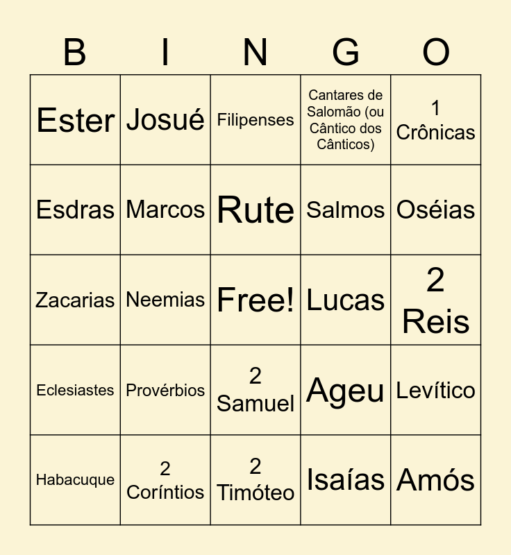 This bingo card has a free space and 67 words: is, Gênesis, Êxodo, Levítico, Números, Deuteronômio, Josué, Juízes, Rute, 1 Samuel, 2 Samuel, 1 Reis, 2 Reis, 1 Crônicas, 2 Crônicas, Esdras, Neemias, Ester, Jó, Salmos, Provérbios, Eclesiastes, Cantares de Salomão (ou Cântico dos Cânticos), Isaías, Jeremias, Lamentações, Ezequiel, Daniel, Oséias, Joel, Amós, Obadias, Jonas, Miquéias, Naum, Habacuque, Sofonias, Ageu, Zacarias, Malaquias, Mateus, Marcos, Lucas, João, Atos dos Apóstolos, Romanos, 1 Coríntios, 2 Coríntios, Gálatas, Efésios, Filipenses, Colossenses, 1 Tessalonicenses, 2 Tessalonicenses, 1 Timóteo, 2 Timóteo, Tito, Filemom, Hebreus, Tiago, 1 Pedro, 2 Pedro, 1 João, 2 João, 3 João, Judas and Apocalipse.
