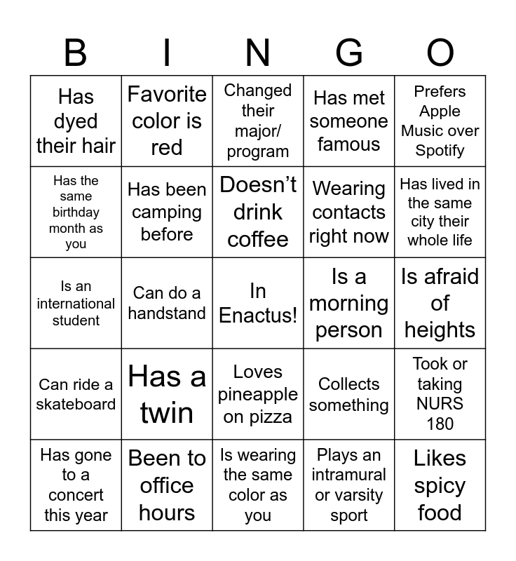 This bingo card has a free space and 39 words: Has a dog, Has pulled an all-nighter before, Has travelled outside of Canada, Has been camping before, Has gone to a concert this year, Loves pineapple on pizza, Doesn’t drink coffee, Is vegetarian or vegan, Prefers Apple Music over Spotify, Can ride a skateboard, Can do a handstand, Has met someone famous, Likes spicy food, Is afraid of heights, Is a morning person, Has a twin, Was born in another country, Has dyed their hair, Favorite season is winter, Collects something, Has the same birthday month as you, Is wearing the same color as you, Wearing contacts right now, Has lived in the same city their whole life, Has gone to a music festival, Can touch their nose with their tongue, Can speak more than one language, Has a hidden talent, Has roommates, Favorite color is red, Is in engineering, Is a 5+ year, Changed their major/ program, Been to office hours, Plays an intramural or varsity sport, Has lost their student ID card, Took or taking NURS 180, Is an international student and Travelled out of North America.