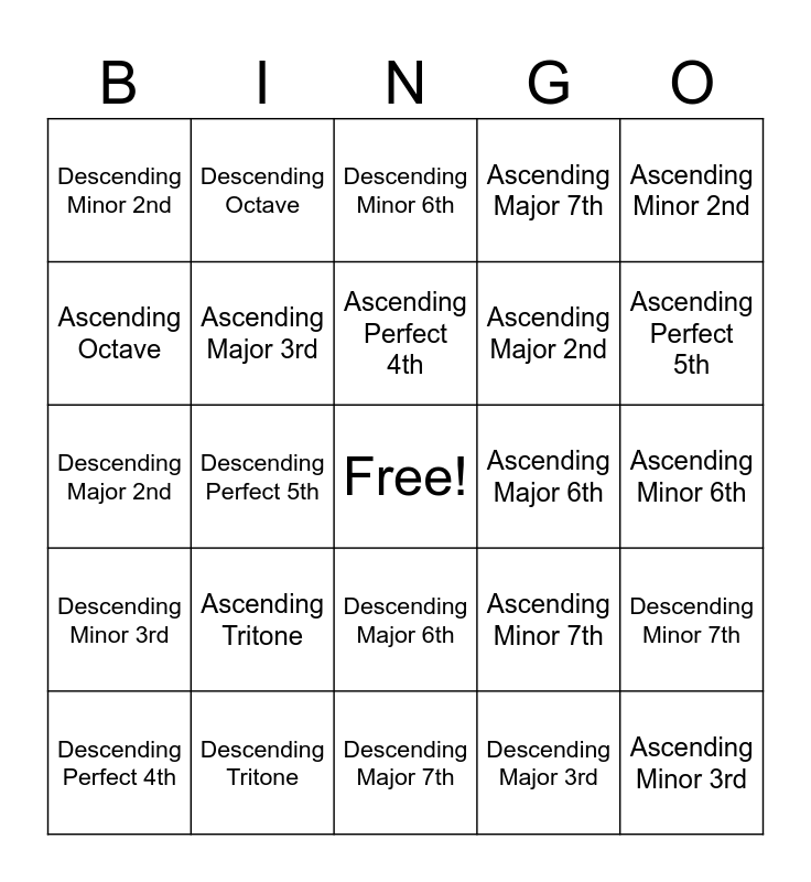 This bingo card has a free space and 24 words: Ascending Tritone, Descending Tritone, Ascending Perfect 4th, Descending Perfect 4th, Ascending Minor 2nd, Descending Minor 2nd, Ascending Octave, Descending Octave, Ascending Major 6th, Descending Major 6th, Ascending Major 2nd, Descending Major 2nd, Ascending Minor 7th, Descending Minor 7th, Ascending Major 3rd, Descending Major 3rd, Ascending Minor 6th, Descending Minor 6th, Ascending Perfect 5th, Descending Perfect 5th, Ascending Minor 3rd, Descending Minor 3rd, Ascending Major 7th and Descending Major 7th.