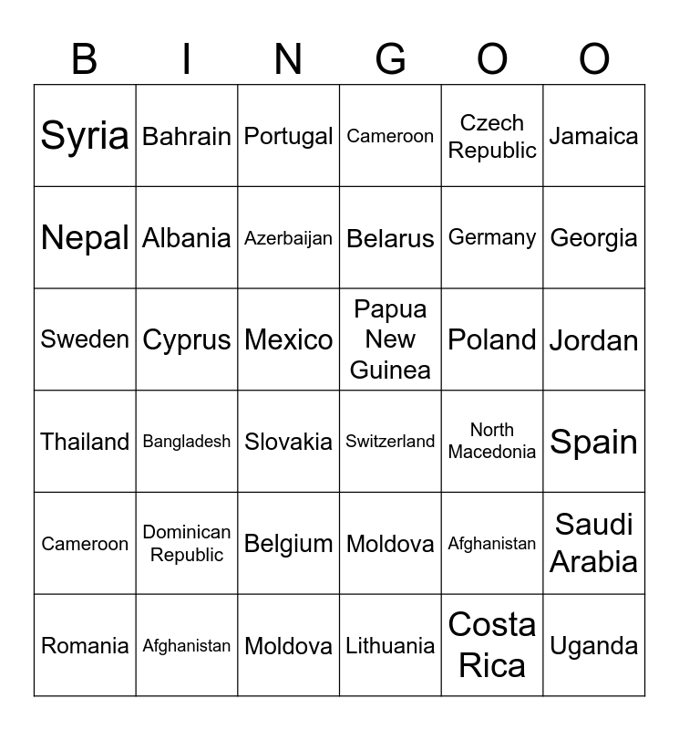 ⚠ This card has duplicate items: Russia (2), Afghanistan (2), Philippines (2), Jordan (2), Italy (2), Nicaragua (2), Papua New Guinea (2), China (2), Belgium (2), Colombia (2), Pakistan (2), Cyprus (2), Saudi Arabia (2), Belarus (2), Netherlands (2), Cameroon (2), Ukraine (2), Croatia (2), Burkina Faso (2), Moldova (2), Switzerland (2), Sweden (2)