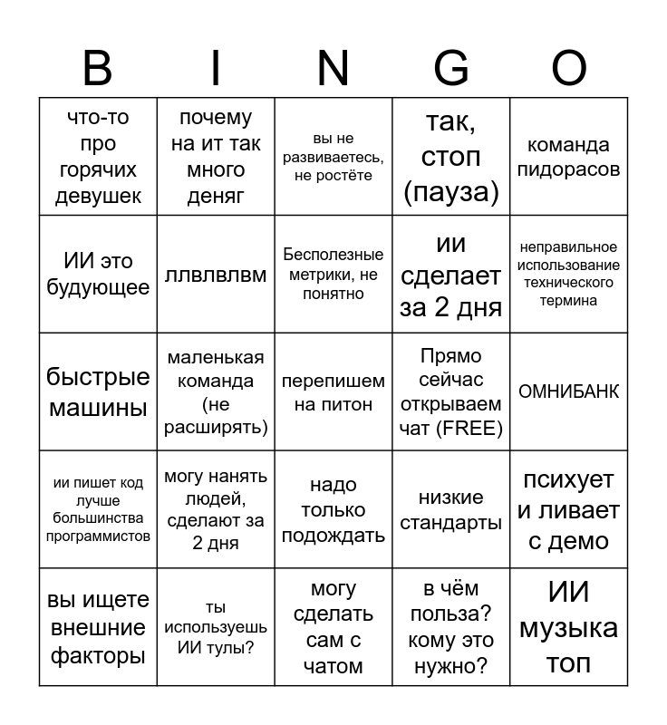 This bingo card has 25 words: могу нанять людей, сделают за 2 дня, могу сделать сам с чатом, Бесполезные метрики, не понятно, вы ищете внешние факторы, команда пидорасов, что-то про горячих девушек, ИИ это будующее, почему на ит так много деняг, Прямо сейчас открываем чат (FREE), надо только подождать, ии сделает за 2 дня, быстрые машины, низкие стандарты, психует и ливает с демо, ллвлвлвм, ИИ музыка топ, ОМНИБАНК, вы не развиваетесь, не ростёте, неправильное использование технического термина, маленькая команда (не расширять), перепишем на питон, ты используешь ИИ тулы?, ии пишет код лучше большинства программистов, так, стоп (пауза) and в чём польза? кому это нужно?.