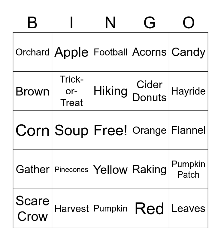 This bingo card has a free space and 44 words: Autumn, Leaves, Corn Maze, Scare Crow, Foliage, Red, Football, Crisp, Candy, Harvest, Acorns, Orange, Yellow, Pinecones, Breeze, Pumpkin, Cider, Corn, Squash, Hayride, Apple, Bonfire, Gourd, Orchard, Maroon, Flannel, Sweater, Boots, Raking, Gather, Cozy, Pumpkin Patch, Spice, Cranberry, Soup, Stew, Gold, Maple, Hiking, Brown, Cider Donuts, Halloween, Trick-or-Treat and Owl.