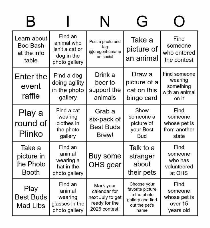 This bingo card has a free space and 24 words: Play Best Buds Mad Libs, Find an animal wearing a hat in the photo gallery, Drink a beer to support the animals, Choose your favorite picture in the photo gallery and find out the pet's name, Find someone who entered the contest, Learn about Boo Bash at the info table, Find an animal who isn't a cat or dog in the photo gallery, Post a photo and tag @oregonhumane on social, Show someone a picture of your Best Bud, Find someone whose pet is from another state, Play a round of Plinko, Find a dog doing agility in the photo gallery, Talk to a stranger about their pets, Find someone who has volunteered at OHS, Enter the event raffle, Find an animal wearing glasses in the photo gallery, Mark your calendar for next July to get ready for the 2026 contest!, Take a picture of an animal, Find someone wearing something with an animal on it, Take a picture in the Photo Booth, Find a cat wearing clothes in the photo gallery, Buy some OHS gear, Draw a picture of a cat on this bingo card and Find someone whose pet is over 15 years old.