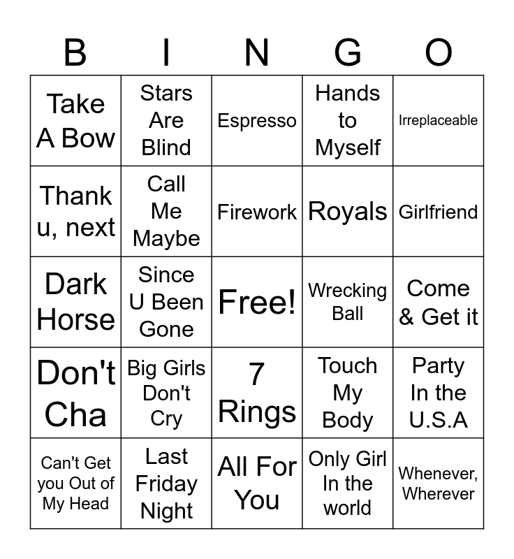 This bingo card has a free space and 40 words: Roar, Dark Horse, Blank Space, Call Me Maybe, Last Friday Night, 7 Rings, Firework, Malibu, Irreplaceable, Don't Cha, Since U Been Gone, Hands to Myself, Whenever, Wherever, Come & Get it, Wrecking Ball, Big Girls Don't Cry, If I were a Boy, Take A Bow, Love You Like a Love Song, Espresso, Party In the U.S.A, Only Girl In the world, Royals, Thank u, next, Hot N Cold, Candy, Lucky, L.O.V.E, See You Again, We Can't Stop, Love Story, Can't Get you Out of My Head, Buttons, Touch My Body, Girlfriend, All For You, Get the Party Started, Show Stopper, Stars Are Blind and Why Can't I?.