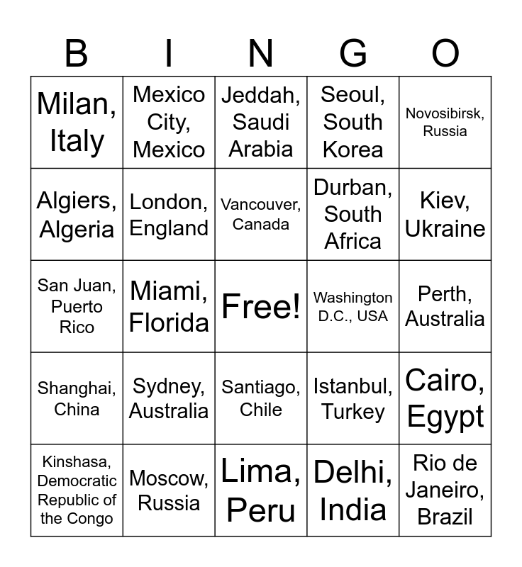 This bingo card has a free space and 25 words: Sydney, Australia, Lima, Peru, Vancouver, Canada, Kinshasa, Democratic Republic of the Congo, Novosibirsk, Russia, Milan, Italy, Algiers, Algeria, Mexico City, Mexico, Washington D.C., USA, Santiago, Chile, Durban, South Africa, San Juan, Puerto Rico, Istanbul, Turkey, Cairo, Egypt, London, England, St. Petersburg, Russia, Perth, Australia, Jeddah, Saudi Arabia, Kiev, Ukraine, Miami, Florida, Rio de Janeiro, Brazil, Moscow, Russia, Shanghai, China, Seoul, South Korea and Delhi, India.