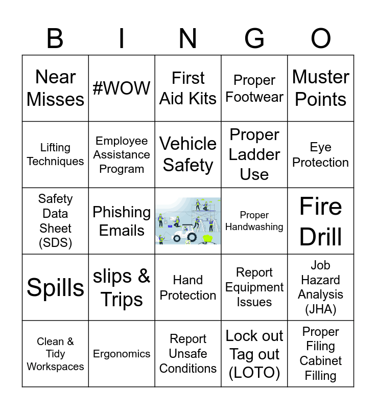 This bingo card has a free space and 28 words: Stepback Program, Ergonomics, Vehicle Safety, Lock out Tag out (LOTO), Muster Points, Near Misses, Employee Assistance Program, Report Unsafe Conditions, Proper Handwashing, Job Hazard Analysis (JHA), Safety Data Sheet (SDS), Phishing Emails, Report Equipment Issues, Proper Filing Cabinet Filling, Lifting Techniques, Hearing Protection, Hand Protection, Proper Footwear, Eye Protection, Clean & Tidy Workspaces, #WOW, Fire Extinguishers, Proper Ladder Use, Fire Drill, Spills, slips & Trips, First Aid Kits and Alertus System.
