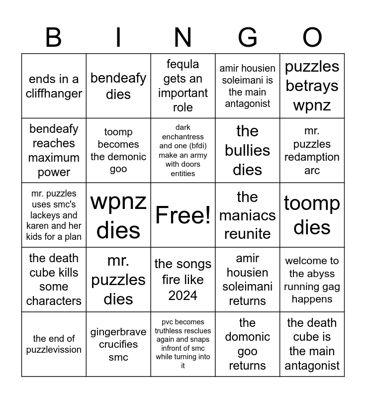 This bingo card has a free space and 24 words: mr. puzzles dies, gingerbrave crucifies smc, dark enchantress and one (bfdi) make an army with doors entities, the end of puzzlevission, puzzles betrays wpnz, ends in a cliffhanger, bendeafy reaches maximum power, bendeafy dies, the maniacs reunite, the songs fire like 2024, the bullies dies, mr. puzzles uses smc's lackeys and karen and her kids for a plan, amir housien soleimani returns, welcome to the abyss running gag happens, toomp becomes the demonic goo, the domonic goo returns, toomp dies, fequla gets an important role, mr. puzzles redamption arc, wpnz dies, the death cube is the main antagonist, the death cube kills some characters, amir housien soleimani is the main antagonist and pvc becomes truthless resclues again and snaps infront of smc while turning into it.
