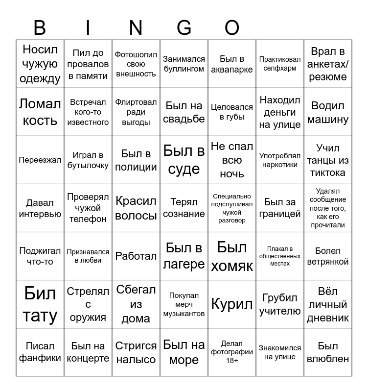 This bingo card has a free space and 48 words: Курил, Находил деньги на улице, Был на море, Проверял чужой телефон, Был в полиции, Удалял сообщение после того, как его прочитали, Пил до провалов в памяти, Был на концерте, Практиковал селфхарм, Был в лагере, Врал в анкетах/резюме, Занимался буллингом, Употреблял наркотики, Не спал всю ночь, Бил тату, Был за границей, Ломал кость, Водил машину, Грубил учителю, Был в аквапарке, Целовался в губы, Красил волосы, Носил чужую одежду, Встречал кого-то известного, Вёл личный дневник, Флиртовал ради выгоды, Учил танцы из тиктока, Писал фанфики, Был в суде, Играл в бутылочку, Знакомился на улице, Специально подслушивал чужой разговор, Болел ветрянкой, Стрелял с оружия, Давал интервью, Был хомяк, Плакал в общественных местах, Переезжал, Работал, Сбегал из дома, Поджигал что-то, Был влюблен, Фотошопил свою внешность, Стригся налысо, Был на свадьбе, Покупал мерч музыкантов, Признавался в любви and Делал фотографии 18+.