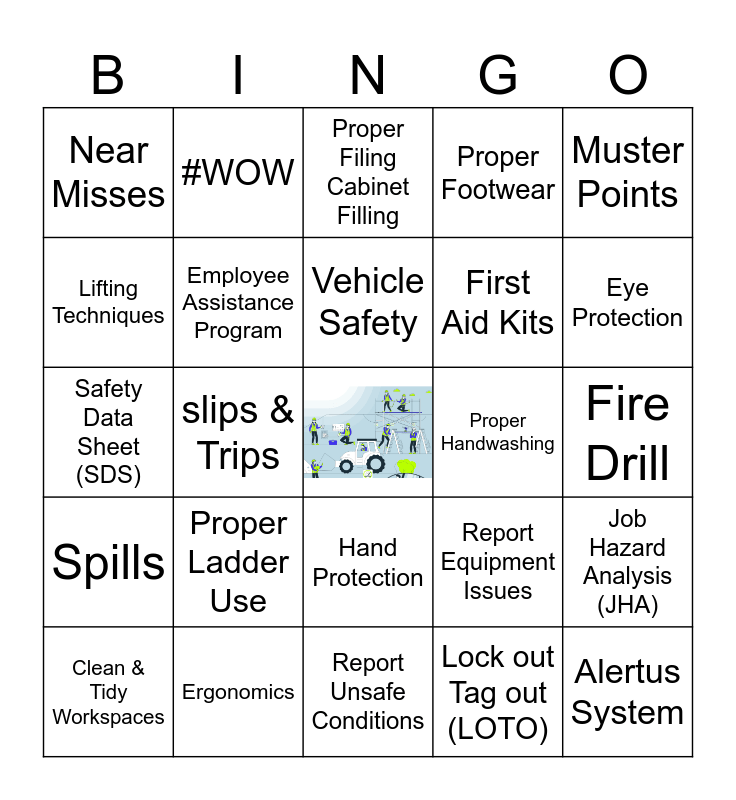 This bingo card has a free space and 28 words: Stepback Program, Ergonomics, Vehicle Safety, Lock out Tag out (LOTO), Muster Points, Near Misses, Employee Assistance Program, Report Unsafe Conditions, Proper Handwashing, Job Hazard Analysis (JHA), Safety Data Sheet (SDS), slips & Trips, Report Equipment Issues, Alertus System, Lifting Techniques, Hearing Protection, Hand Protection, Proper Footwear, Eye Protection, Clean & Tidy Workspaces, #WOW, Fire Extinguishers, First Aid Kits, Fire Drill, Spills, Proper Ladder Use, Proper Filing Cabinet Filling and Phishing Emails.