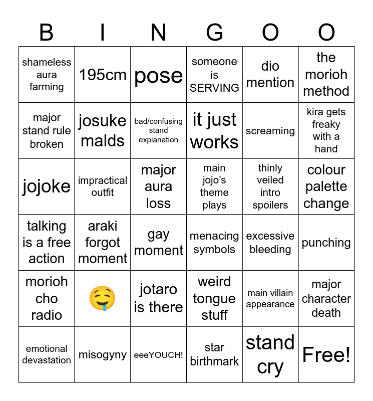 This bingo card has 43 words: Free!, jojoke, localized name, gay moment, weird tongue stuff, punching, pose, uncomfortable sexual scene, dio mention, menacing symbols, someone is SERVING, impractical outfit, colour palette change, thinly veiled intro spoilers, eeeYOUCH!, excessive bleeding, major character death, screaming, moment that fans will not let go, it just works, 195cm, emotional devastation, main villain appearance, shameless aura farming, put some CLOTHES on, major aura loss, 🤤, strange lipstick colour, talking is a free action, main jojo’s theme plays, animal cruelty, araki forgot moment, misogyny, kira gets freaky with a hand, jotaro is there, star birthmark, morioh cho radio, josuke malds, the morioh method, bad/confusing stand explanation, stand cry, major stand rule broken and stand display card.
