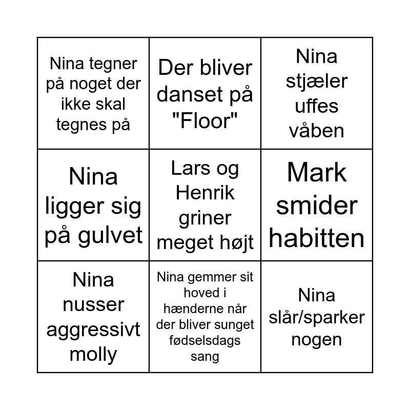 This bingo card has 52 words: Der bliver serveret en lækker bryllupskage., En gæst fælder en tåre., Katrine smider sit slør., Brudeparret kysser på kommando., Alle klirrer på deres glas., Bruden og gommen skærer bryllupskagen sammen, Der bliver danset på "Floor", Der bliver råbt "Skål!"., Mark smider habitten, Nina spiller klaver efter nogen siger hun ikke må, Nina nusser aggressivt molly, Nina fighter uffe, Uffe læser Anders and blade, Nina klipper i ting hun finder, Nina laver en spontan vejrmølle, Nina står på hænder, Nina gemmer sit hoved i hænderne når der bliver sunget fødselsdags sang, Nina stiller sig random op, Henrik fortæller en dårlig joke, Lars og Henrik griner meget højt, Nina laver tricks på trampolinen, Nina skater, Nina tegner på noget der ikke skal tegnes på, Nina slår/sparker nogen, Nina kigger nogen i øjnene i ubehagelig lang tid, Nogen spilder deres drink, Sarah, Nina og Astrid snakker om at Trade svenskere(ikke spørg), Nina laver parkour indenfor, Der bliver sagt tillykke 15 gange, Nina kan ikke læse det der står i et kort, Molly humper nina, Nina ligger sig på gulvet, Nina brokker sig, Nogen fodre molly, Nina laver nina movet(står på gulvet og bøjer i knæene mens hun bevæger sine arme op og ned), Nina stjæler uffes våben, Nina kalder nogen for abe 2 gange, Nina løber, Nina hopper, Nina snurre rundt, Nina går randomly ned i kælderen, Alle klapper, Nina krammer folk, Nina synger, Nina glemmer noget vigtigt, Nina låser nogens telefon op og tager en selfie, Nina har høretelefoner om halsen, Nina spiser slik, Nina stjæler folks ting, Nina……….. gør ikke en skid, En gæst tager en selfie med brudeparret. and Brudeparret danser vals..