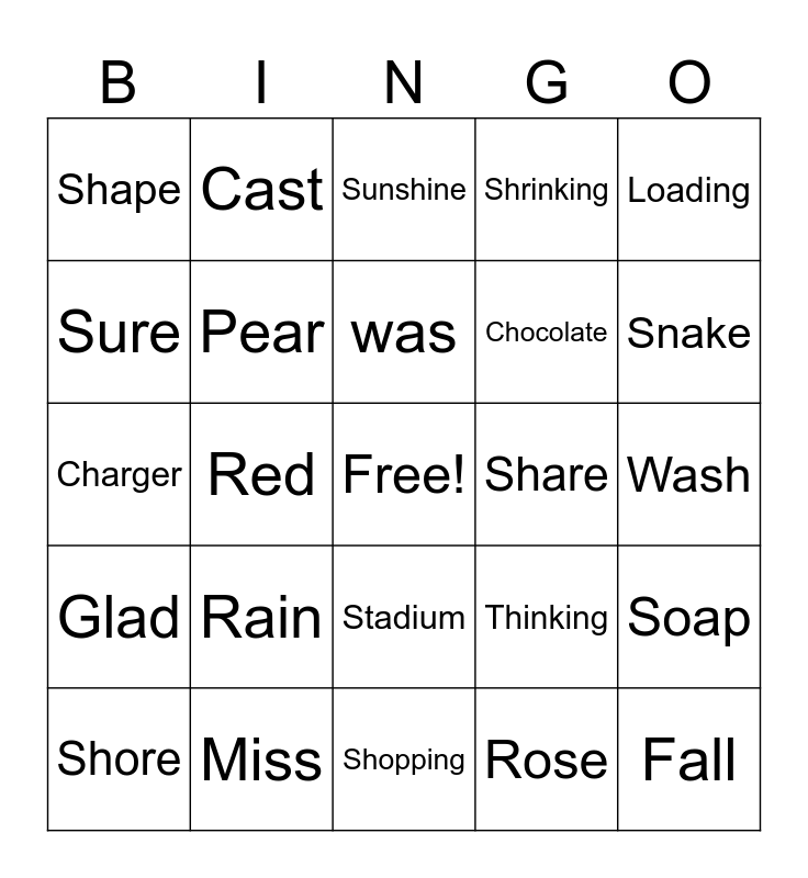 This bingo card has a free space and 84 words: Story, Sun, Sunshine, Skip, Stop, Light, Lamp, Load, Pals, Care, Hair, Fair, Pear, Share, Chair, Shape, Shore, Sure, Sheep, Shake, Milkshake, Chocolate, Fall, Scooter, Red, Race, Rice, Ring, RIde, Rattle, Rain, Rolls, Ram, Charger, Chore, Shoppers, Shopping, Soccer, Snake, Glad, Forest, Pass, Columbus, Bus, Fuss, Last, Cast, Past, Faster, Thanksgiving, Thankful, Thinking, Shrinking, She, Shapes, Paste, Miss, was, Short, Wash, Cash, Hashbrowns, Bashful, Does, Recycle, Raccoon, Lemon, Lime, Loading, Soup, Soap, Singers, Soccer Player, Soccer ball, Stadium, Rose, flower, Shiny, Shatter, Shed, Shamrock, Show, Washing Machine and Parrot.