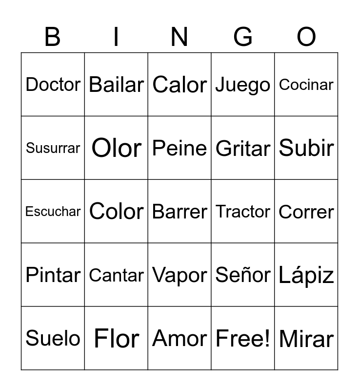 This bingo card has 30 words: Flor, Motor, Color, Tambor, Doctor, Calor, Olor, Vapor, Tractor, Amor, Correr, Barrer, Free!, Mirar, Subir, Mar, Señor, Pintar, Cantar, Cocinar, Escuchar, Sorprender, Bailar, Gritar, Susurrar, Juego, Lápiz, Suelo, Peine and Mesa.