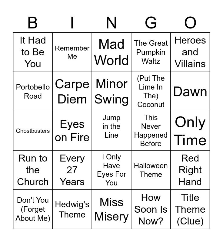 This bingo card has 55 words: Iris, Don't You (Forget About Me), Into the Unknown, It Had to Be You, Miss Misery, I Put a Spell on You, Carpe Diem, Spirit in the Sky, (Put The Lime In The) Coconut, Remember Me This Way, The Great Pumpkin Waltz, Ain't No Mountain High Enough, Over The Rainbow, This Is Halloween, Knives Out, Halloweentown Theme, Heroes and Villains, Eyes on Fire, Autumn in New York, Jump in the Line, This Never Happened Before, One Way or Another, Halloween Theme, Mad World, That'll Be The Day, Minor Swing, How Soon Is Now?, Main Titles (Sleepy Hollow), Only Time, Red Right Hand, Devil's Dance, From West Texas, Bitter Sweet Symphony, God is God, Portobello Road, Ghostbusters, Addams Groove, Run to the Church, Title Theme (Clue), Main Title (Death Becomes Her), Remember Me, Kiss With A Fist, The Heart of Every GIrl, Don't You Worry 'Bout A Thing, Every 27 Years, Hedwig's Theme, It's Romance, Ice Dance, Grim Grinning Ghosts, Dawn, Flying, Don't Let The Stars Get In Your Eyes, Other Father Song, I Only Have Eyes For You and The Goonies 'R' Good Enough.
