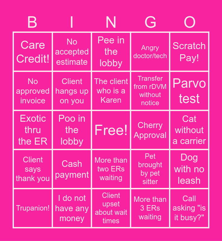 This bingo card has a free space and 24 words: Cash payment, I do not have any money, The client who is a Karen, Trupanion!, Scratch Pay!, Care Credit!, No approved invoice, No accepted estimate, Cherry Approval, More than two ERs waiting, Transfer from rDVM without notice, Exotic thru the ER, Pet brought by pet sitter, Dog with no leash, Client hangs up on you, More than 3 ERs waiting, Cat without a carrier, Pee in the lobby, Parvo test, Poo in the lobby, Call asking "is it busy?", Client says thank you, Angry doctor/tech and Client upset about wait times.