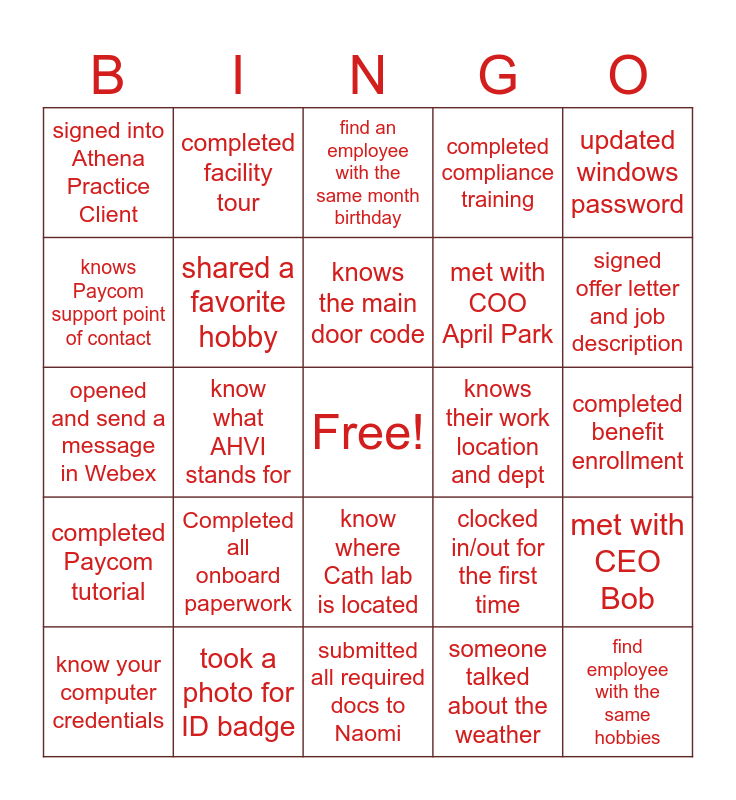 This bingo card has a free space and 24 words: Completed all onboard paperwork, took a photo for ID badge, knows the main door code, know your computer credentials, updated windows password, signed into Athena Practice Client, knows Paycom support point of contact, completed facility tour, knows their work location and dept, know where Cath lab is located, met with COO April Park, opened and send a message in Webex, clocked in/out for the first time, met with CEO Bob, shared a favorite hobby, someone talked about the weather, completed benefit enrollment, find an employee with the same month birthday, signed offer letter and job description, know what AHVI stands for, find employee with the same hobbies, completed Paycom tutorial, completed compliance training and submitted all required docs to Naomi.