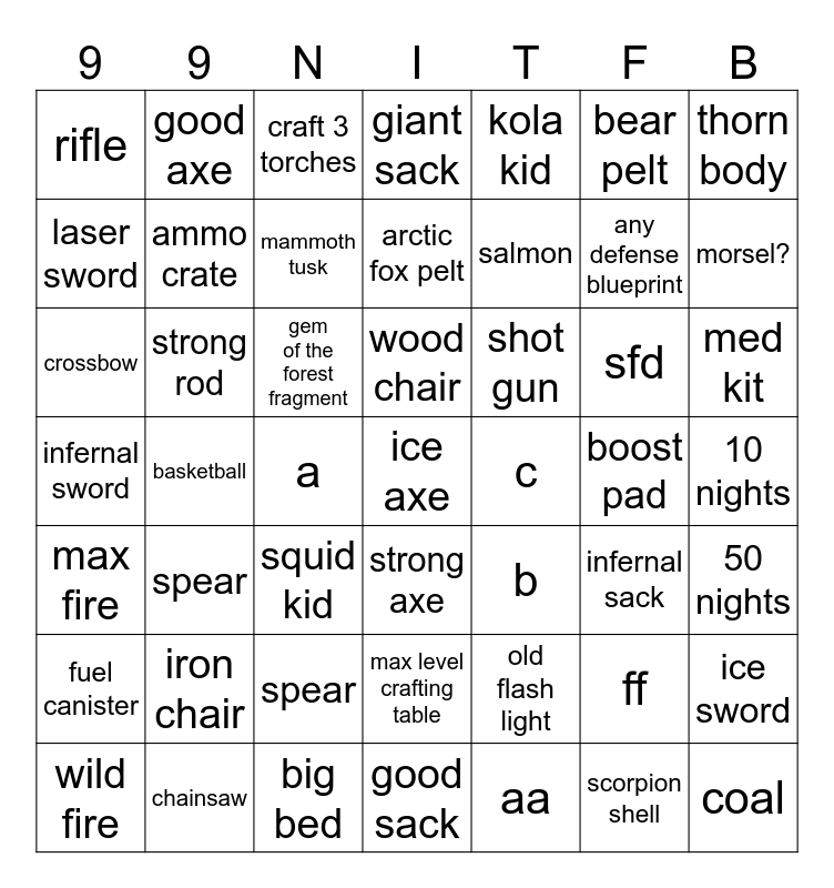 This bingo card has 56 words: scorpion shell, med kit, 99 nights, rifle, basketball, spear, thorn body, kraken kid, ammo crate, max level crafting table, giant sack, fuel canister, max fire, 10 nights, chainsaw, spear, kola kid, salmon, coal, any defense blueprint, morsel?, squid kid, shot gun, craft 3 torches, dino kid, laser sword, boost pad, oil barrel, mammoth tusk, strong axe, any 10 fish, 50 nights, wild fire, big bed, crossbow, bear pelt, arctic fox pelt, iron chair, strong rod, good axe, wood chair, ice axe, old flash light, apple, ice sword, gem of the forest fragment, infernal sword, good sack, infernal sack, c, a, b, ff, aa, sfd and sd.