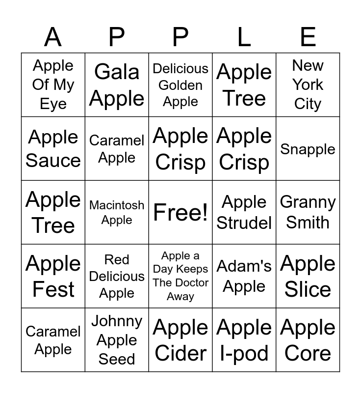 This bingo card has a free space and 24 words: Red Delicious Apple, Johnny Apple Seed, Apple Crisp, Caramel Apple, New York City, Apple Of My Eye, Apple Sauce, Gala Apple, Apple Strudel, Apple a Day Keeps The Doctor Away, Apple Crisp, Apple Tree, Adam's Apple, Apple Slice, Caramel Apple, Apple I-pod, Granny Smith, Delicious Golden Apple, Snapple, Macintosh Apple, Apple Core, Apple Fest, Apple Tree and Apple Cider.
