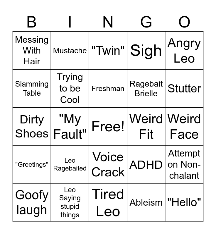 This bingo card has a free space and 24 words: Leo Ragebaited, Leo Saying stupid things, Freshman, Goofy laugh, Angry Leo, Messing With Hair, Slamming Table, Mustache, Weird Fit, Voice Crack, Ragebait Brielle, Dirty Shoes, ADHD, Attempt on Non-chalant, Trying to be Cool, Ableism, Weird Face, "Twin", Stutter, "My Fault", "Hello", "Greetings", Sigh and Tired Leo.