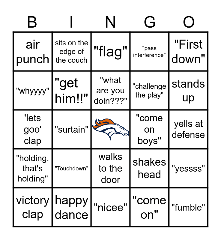 This bingo card has a free space and 24 words: "Touchdown", happy dance, "what are you doin???", victory clap, "First down", air punch, "whyyyy", sits on the edge of the couch, "come on boys", walks to the door, "challenge the play", 'lets goo' clap, shakes head, "yessss", "get him!!", "come on", yells at defense, "flag", stands up, "surtain", "fumble", "holding, that's holding", "pass interference" and "nicee".