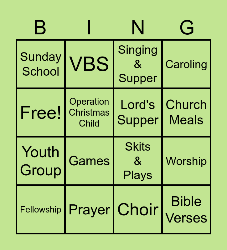 This bingo card has 16 words: Prayer, Worship, Singing & Supper, Sunday School, Youth Group, VBS, Skits & Plays, Choir, Free!, Operation Christmas Child, Fellowship, Caroling, Games, Church Meals, Lord's Supper and Bible Verses.
