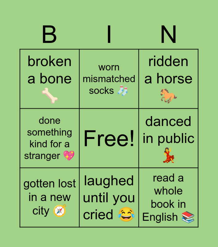 This bingo card has a free space and 11 words: taken a road trip ð, laughed until you cried ð, read a whole book in English ð, gotten lost in a new city ð§, worn mismatched socks ð§Ķ, ridden a horse ð, danced in public ð, learned something from YouTube ðŧ, done something kind for a stranger ð, broken a bone ðĶī and made a handmade gift ðĻ.