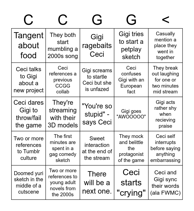 This bingo card has a free space and 24 words: The first minutes are spent in a gag comedy sketch, Two or more references to young adult novels from the 2000s, Gigi screams to startle Ceci but she is unfazed, Doomed yuri sketch in the middle of a cutscene, Casually mention a place they went in together, Tangent about food, Ceci talks to Gigi about a new project, They both start mumbling a 2000s song, Gigi goes "AWOOOOO", Sweet interaction at the end of the stream, Ceci confuses Gigi with an European fact, Ceci dares Gigi to throw/fail the game, They mock and belittle the protagonist of the game, Ceci self interrupts before saying anything embarrassing, Ceci references a previous CCGG collab, Ceci starts "crying", Gigi acts rather shy when recieving praise, Gigi ragebaits Ceci, They break out laughing for one or two minutes mid stream, They're streaming with their 3D models, Ceci and Gigi sync their words (ala FWMC), Two or more references to Tumblr culture, Gigi tries to start a petplay sketch and There will be a next one..