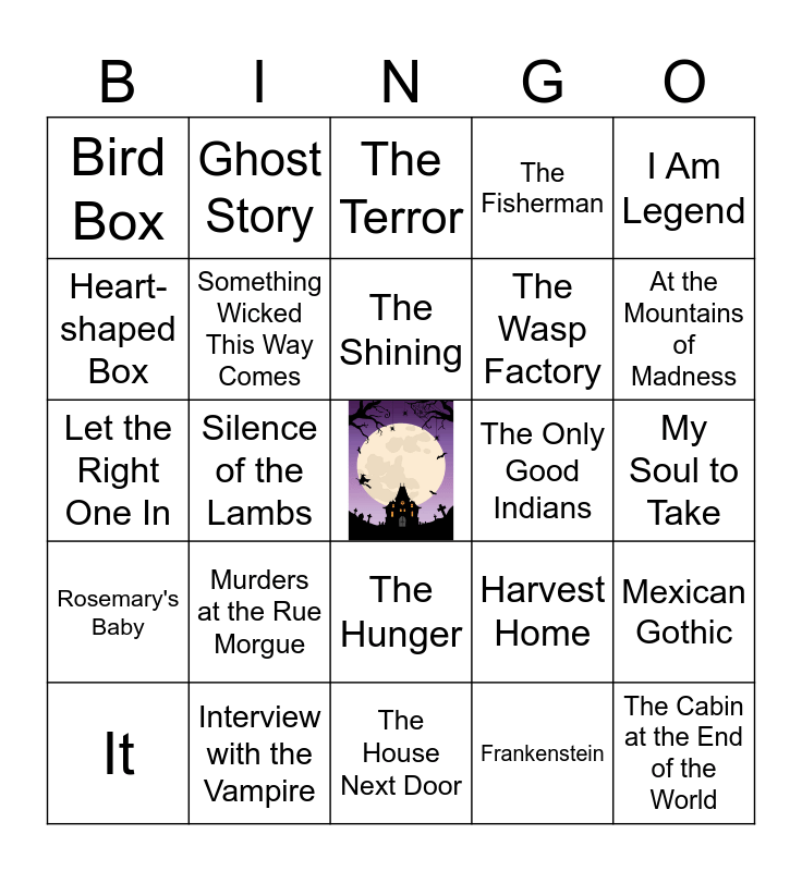 This bingo card has a free space and 34 words: Dracula, Frankenstein, The Haunting of Hill House, The Exorcist, Rosemary's Baby, Something Wicked This Way Comes, I Am Legend, It, Ghost Story, Pet Sematary, The Shining, The Terror, Turn of the Screw, Bunny, The Only Good Indians, At the Mountains of Madness, Interview with the Vampire, Let the Right One In, Murders at the Rue Morgue, Harvest Home, The Hunger, Fantastic land, Bird Box, My Soul to Take, The House Next Door, The Cabin at the End of the World, The Fisherman, Tender is the Flesh, The Wasp Factory, Heart-shaped Box, The Little Stranger, Silence of the Lambs, Mexican Gothic and The Buffalo Hunter Hunter.