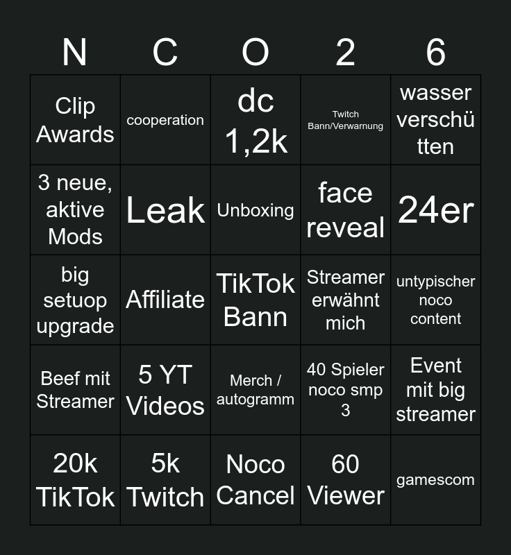 This bingo card has 25 words: Beef mit Streamer, 5k Twitch, TikTok Bann, 60 Viewer, wasser verschü tten, Clip Awards, cooperation, dc 1,2k, Streamer erwähnt mich, Event mit big streamer, 3 neue, aktive Mods, Leak, Noco Cancel, 40 Spieler noco smp 3, 24er, 20k TikTok, Affiliate, Unboxing, face reveal, untypischer noco content, big setuop upgrade, 5 YT Videos, Merch / autogramm, Twitch Bann/Verwarnung and gamescom.