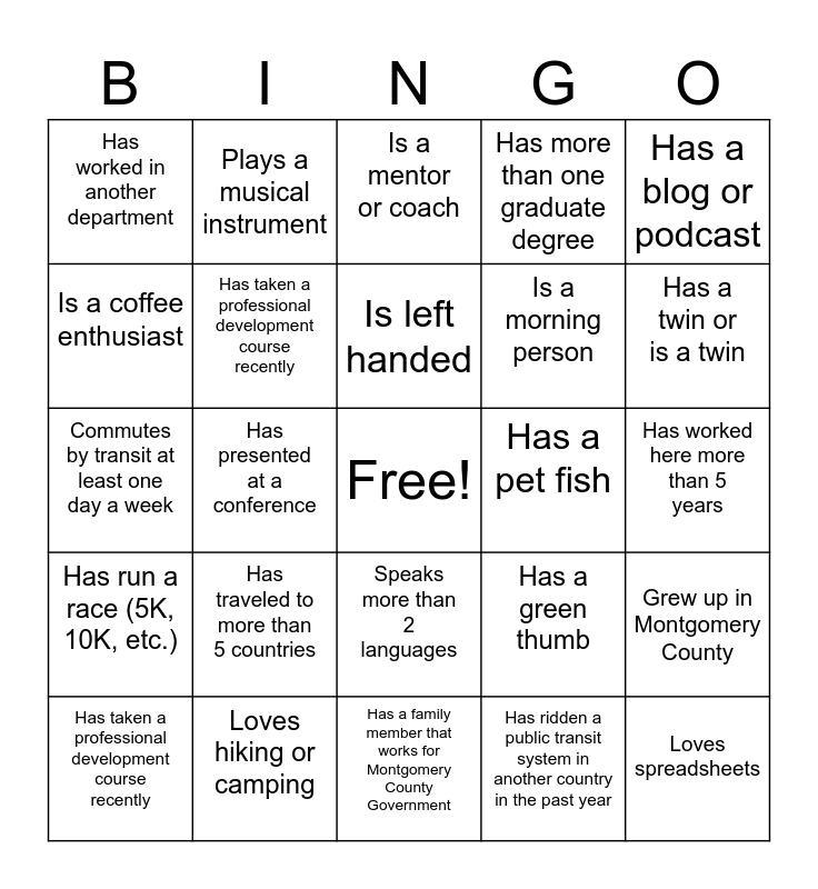 This bingo card has a free space and 29 words: Has taken a professional development course recently, Has a standing desk, Has presented at a conference, Enjoys cooking or baking, Has worked in another department, Is a mentor or coach, Has taken a professional development course recently, Has traveled to more than 5 countries, Has a pet fish, Loves hiking or camping, Has worked here more than 5 years, Loves spreadsheets, Has a family member that works for Montgomery County Government, Has ridden a public transit system in another country in the past year, Has a twin or is a twin, Has a PE license, Speaks more than 2 languages, Has run a race (5K, 10K, etc.), Has a blog or podcast, Commutes by transit at least one day a week, Has a green thumb, Works best with music on, Is a morning person, Is a coffee enthusiast, Has more than one graduate degree, Plays a musical instrument, Grew up in Montgomery County, Is left handed and Has been to a live concert in the past month.