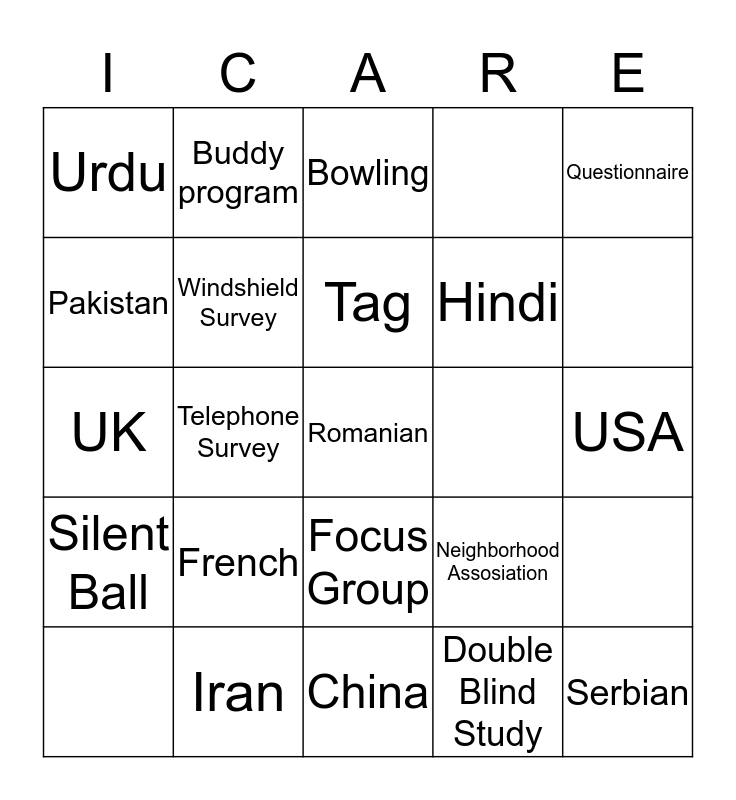 This bingo card has 20 words: French, China, Tag, Questionnaire, Urdu, Pakistan, Buddy program, Focus Group, Hindi, UK, Neighborhood Assosiation, Windshield Survey, Serbian, USA, Bowling, Telephone Survey, Romanian, Iran, Silent Ball and Double Blind Study.