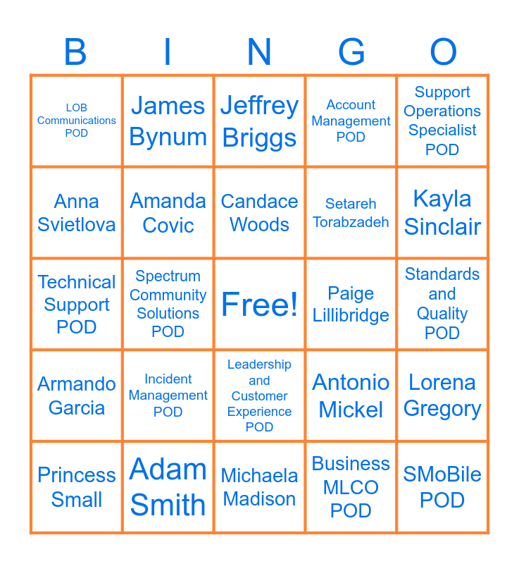 This bingo card has a free space and 27 words: Antonio Mickel, Laleh Safarzadeh, Setareh Torabzadeh, Michaela Madison, Anna Svietlova, Jeffrey Briggs, James Bynum, Armando Garcia, Paige Lillibridge, Lorena Gregory, Technical Support POD, Account Management POD, Princess Small, Adam Smith, Kayla Sinclair, Chris Perez, Amanda Covic, Candace Woods, Incident Management POD, LOB Communications POD, Standards and Quality POD, Business MLCO POD, Spectrum Community Solutions POD, SMoBile POD, Leadership and Customer Experience POD, Support Operations Specialist POD and Strategic Initiatives POD.