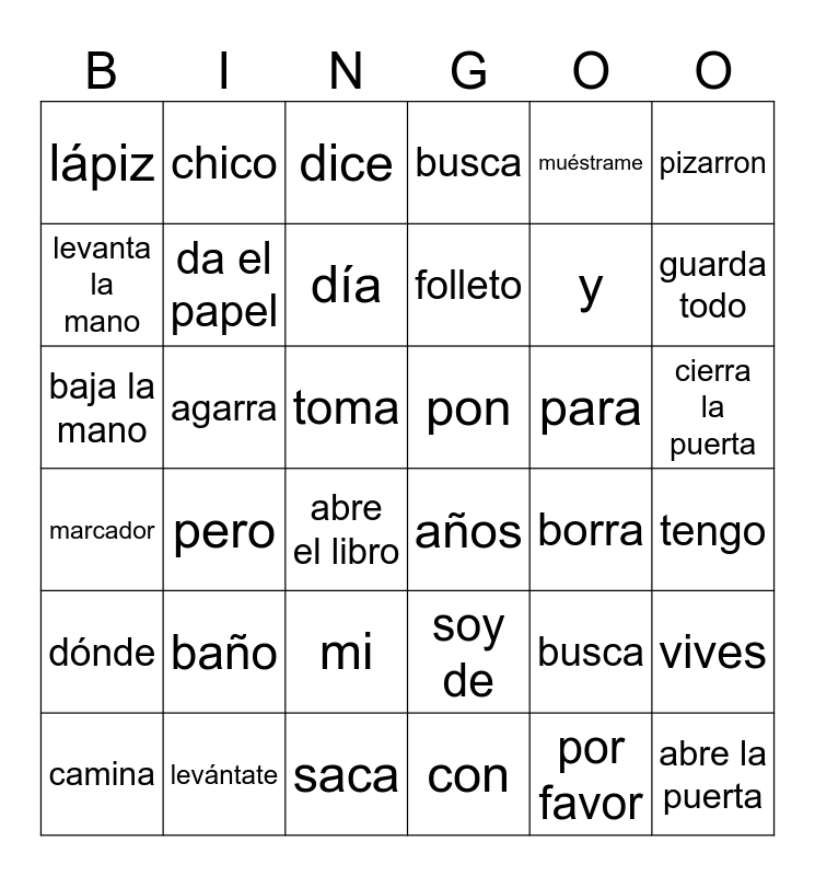This bingo card has 39 words: levántate, camina, silencio, levanta la mano, abre el libro, cierra la puerta, da el papel, abre la puerta, muéstrame, pon, guarda todo, busca, baja la mano, toma, agarra, para, busca, lápiz, saca, marcador, pizarron, borra, día, folleto, con, mi, dónde, por favor, baño, chico, qué, vives, dice, años, tengo, soy de, pero, y and cuaderno.