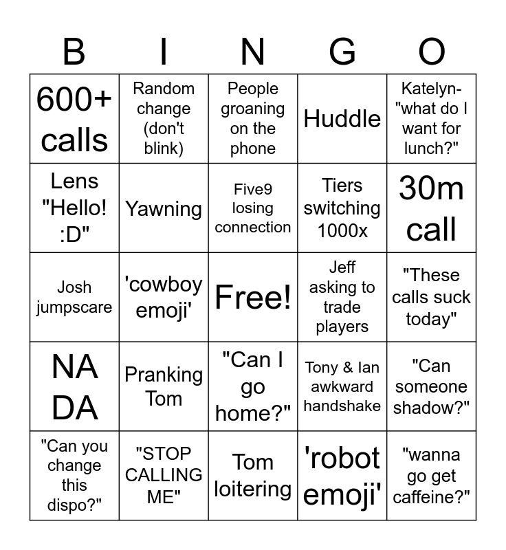 This bingo card has a free space and 24 words: Pranking Tom, "STOP CALLING ME", Five9 losing connection, "Can you change this dispo?", Katelyn- "what do I want for lunch?", 600+ calls, Lens "Hello! :D", Random change (don't blink), Jeff asking to trade players, "Can I go home?", Tiers switching 1000x, Josh jumpscare, Tony & Ian awkward handshake, "Can someone shadow?", Yawning, 'robot emoji', "These calls suck today", People groaning on the phone, 30m call, 'cowboy emoji', "wanna go get caffeine?", NA DA, Huddle and Tom loitering.