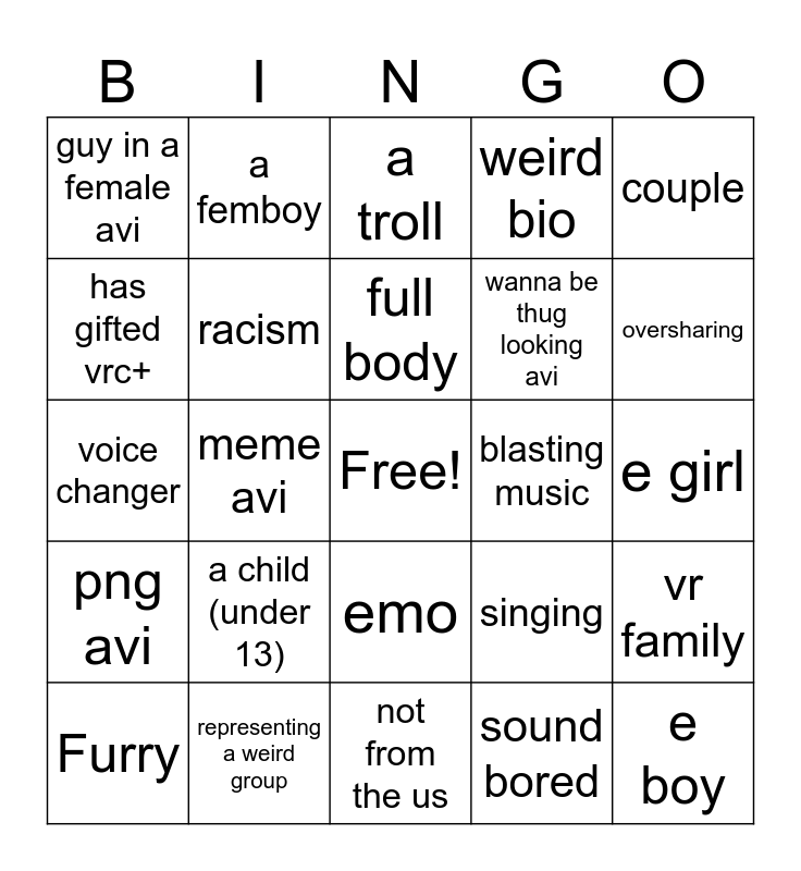 This bingo card has a free space and 24 words: Furry, a child (under 13), full body, sound bored, couple, guy in a female avi, a femboy, a troll, blasting music, e girl, voice changer, racism, singing, vr family, has gifted vrc+, representing a weird group, not from the us, weird bio, oversharing, png avi, meme avi, emo, wanna be thug looking avi and e boy.
