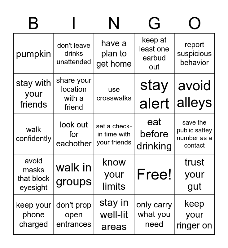 This bingo card has 25 words: walk in groups, stay in well-lit areas, use crosswalks, keep your phone charged, report suspicious behavior, pumpkin, stay with your friends, don't leave drinks unattended, eat before drinking, know your limits, stay alert, walk confidently, Free!, trust your gut, share your location with a friend, keep your ringer on, save the public saftey number as a contact, have a plan to get home, avoid alleys, look out for eachother, set a check-in time with your friends, don't prop open entrances, avoid masks that block eyesight, keep at least one earbud out and only carry what you need.
