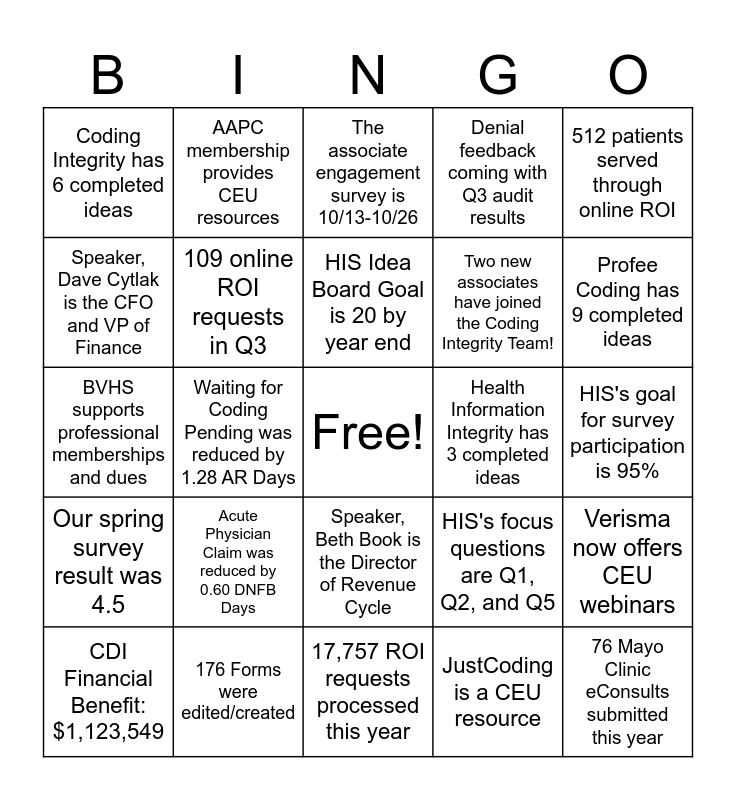 This bingo card has a free space and 29 words: CDI Financial Benefit: $1,123,549, Waiting for Coding - Clinic was reduced by 3.87 AR Days, Waiting for Coding Pending was reduced by 1.28 AR Days, Scanning remained within their turnaround time goals ALL YEAR!, Coding Integrity has 6 completed ideas, The associate engagement survey is 10/13-10/26, 109 online ROI requests in Q3, Acute Physician Claim was reduced by 0.60 DNFB Days, Health Information Integrity has 3 completed ideas, 176 Forms were edited/created, HIS's goal for survey participation is 95%, 76 Mayo Clinic eConsults submitted this year, 17,757 ROI requests processed this year, JustCoding is a CEU resource, Profee Coding has 9 completed ideas, Both coding teams have achieved a 96% quality score!, Speaker, Beth Book is the Director of Revenue Cycle, Our spring survey result was 4.5, 512 patients served through online ROI, BVHS supports professional memberships and dues, HIS's focus questions are Q1, Q2, and Q5, Our DNFB target for October is 9.3 AR Days, Two new associates have joined the Coding Integrity Team!, Speaker, Dave Cytlak is the CFO and VP of Finance, Denial feedback coming with Q3 audit results, AAPC membership provides CEU resources, Verisma now offers CEU webinars, HIS Idea Board Goal is 20 by year end and Speaker, John Fenton is the Director of Information Services.