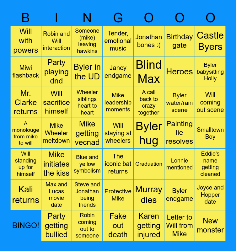 This bingo card has 49 words: Byler endgame, Heroes, Karen getting injured, Mike Wheeler meltdown, Wheeler siblings heart to heart, Smalltown Boy, Robin and Will interaction, Robin coming out to someone, Birthday gate, The iconic bat returns, Castle Byers, Tender, emotional music, Byler water/rain scene, A call back to crazy together, Max and Lucas movie date, Painting lie resolves, Miwi flashback, Byler babysitting Holly, Joyce and Hopper date, Jonathan bones :(, Blind Max, Mike getting vecnad, Will with powers, Party playing dnd, BINGO!, Byler in the UD, Will coming out scene, Party getting bullied, Mike leadership moments, Will sacrifice himself, New monster, Byler hug, Kali returns, Steve and Jonathan being friends, A monolouge from mike to will, Graduation, Lonnie mentioned, Eddie's name getting cleaned, Mr. Clarke returns, Blue and yellow symbolism, Protective Mike, Will standing up for himself, Will staying at wheelers, Fake out death, Jancy endgame, Someone (mike) leaving hawkins, Murray dies, Mike initiates the kiss and Letter to Will from Mike.