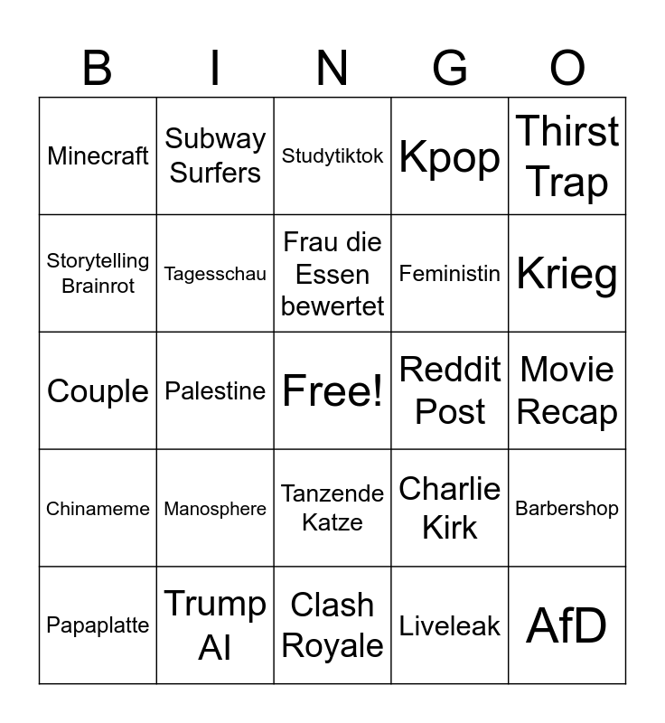 This bingo card has a free space and 24 words: Manosphere, Trump AI, Frau die Essen bewertet, Papaplatte, Thirst Trap, Minecraft, Storytelling Brainrot, Subway Surfers, Reddit Post, Tanzende Katze, Feministin, Couple, Charlie Kirk, Barbershop, Tagesschau, Liveleak, Movie Recap, Studytiktok, Krieg, Palestine, AfD, Chinameme, Kpop and Clash Royale.
