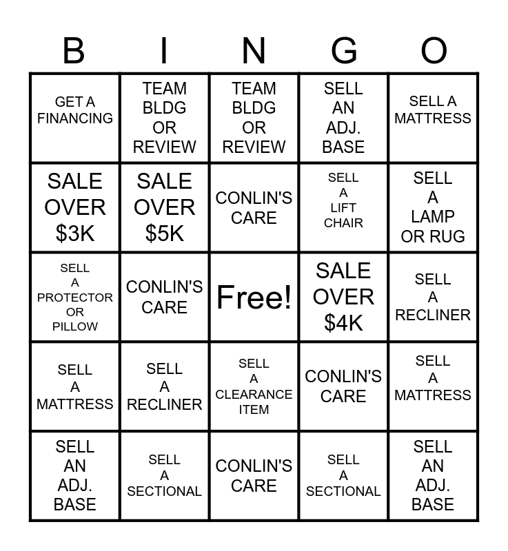 This bingo card has a free space and 24 words: SELL A RECLINER, SELL A SECTIONAL, CONLIN'S CARE, SELL AN ADJ. BASE, SELL A MATTRESS, GET A FINANCING, SALE OVER $3K, TEAM BLDG OR REVIEW, SALE OVER $4K, SELL A CLEARANCE ITEM, SELL A LIFT CHAIR, SELL A PROTECTOR OR PILLOW, CONLIN'S CARE, SELL A MATTRESS, SALE OVER $5K, SELL A SECTIONAL, SELL A RECLINER, TEAM BLDG OR REVIEW, SELL A LAMP OR RUG, CONLIN'S CARE, SELL AN ADJ. BASE, SELL A MATTRESS, SELL AN ADJ. BASE and CONLIN'S CARE.