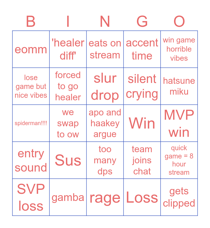 This bingo card has a free space and 24 words: Sus, gamba, slur drop, SVP loss, win game horrible vibes, eomm, lose game but nice vibes, 'healer diff', Win, too many dps, silent crying, spiderman!!!!, team joins chat, quick game = 8 hour stream, forced to go healer, Loss, MVP win, eats on stream, hatsune miku, we swap to ow, gets clipped, entry sound, accent time and rage.