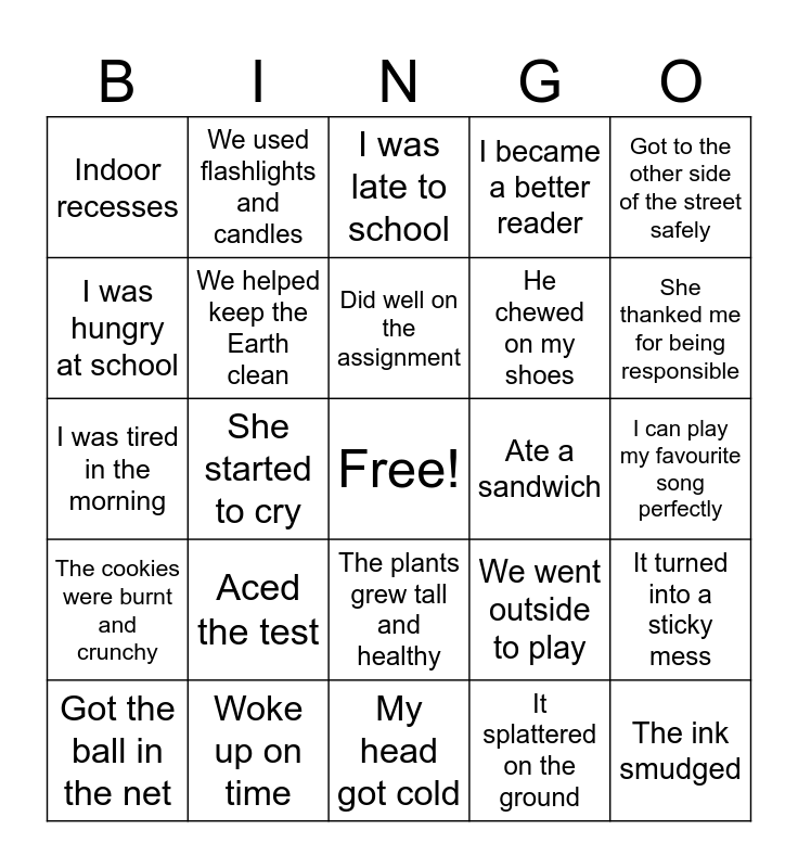 This bingo card has a free space and 24 words: Aced the test, Woke up on time, Did well on the assignment, Got the ball in the net, Got to the other side of the street safely, Indoor recesses, I was hungry at school, We used flashlights and candles, Ate a sandwich, The plants grew tall and healthy, He chewed on my shoes, I was tired in the morning, We went outside to play, It turned into a sticky mess, We helped keep the Earth clean, It splattered on the ground, I can play my favourite song perfectly, I was late to school, She thanked me for being responsible, She started to cry, The ink smudged, The cookies were burnt and crunchy, I became a better reader and My head got cold.