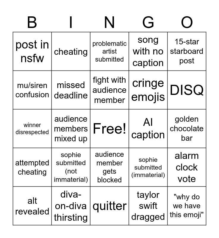 This bingo card has a free space and 25 words: sophie submitted (not immaterial), quitter, fight with audience member, alt revealed, 15-star starboard post, post in nsfw, mu/siren confusion, cheating, AI caption, audience member gets blocked, cringe emojis, winner disrespected, sophie submitted (immaterial), alarm clock vote, missed deadline, devious twist, golden chocolate bar, problematic artist submitted, DISQ, audience members mixed up, "why do we have this emoji", diva-on-diva thirsting, attempted cheating, song with no caption and taylor swift dragged.