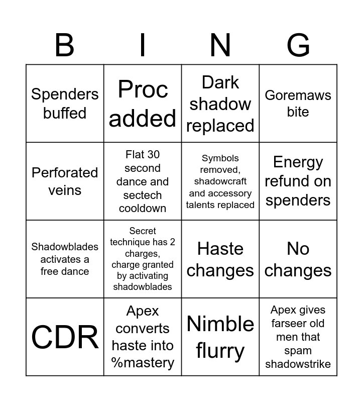 This bingo card has 16 words: Apex converts haste into %mastery, No changes, Dark shadow replaced, Spenders buffed, Shadowblades activates a free dance, Proc added, Haste changes, Nimble flurry, Perforated veins, Flat 30 second dance and sectech cooldown, CDR, Goremaws bite, Secret technique has 2 charges, charge granted by activating shadowblades, Energy refund on spenders, Symbols removed, shadowcraft and accessory talents replaced and Apex gives farseer old men that spam shadowstrike.