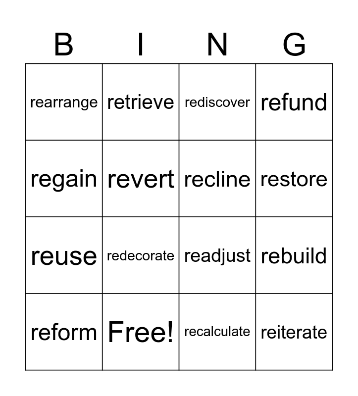 This bingo card has 16 words: Free!, rebuild, rediscover, rearrange, reuse, retrieve, readjust, recalculate, regain, revert, reform, refund, redecorate, restore, recline and reiterate.