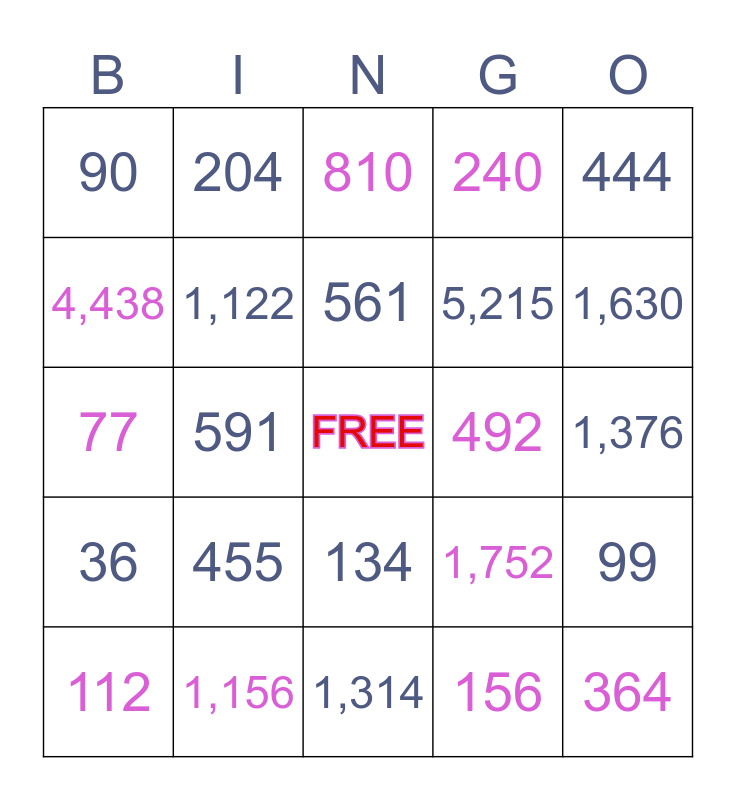 This bingo card has a free space and 24 words: 455, 1,156, 561, 112, 444, 90, 4,438, 204, 492, 134, 5,215, 77, 1,752, 99, 1,122, 156, 1,376, 810, 1,630, 591, 364, 36, 240 and 1,314.