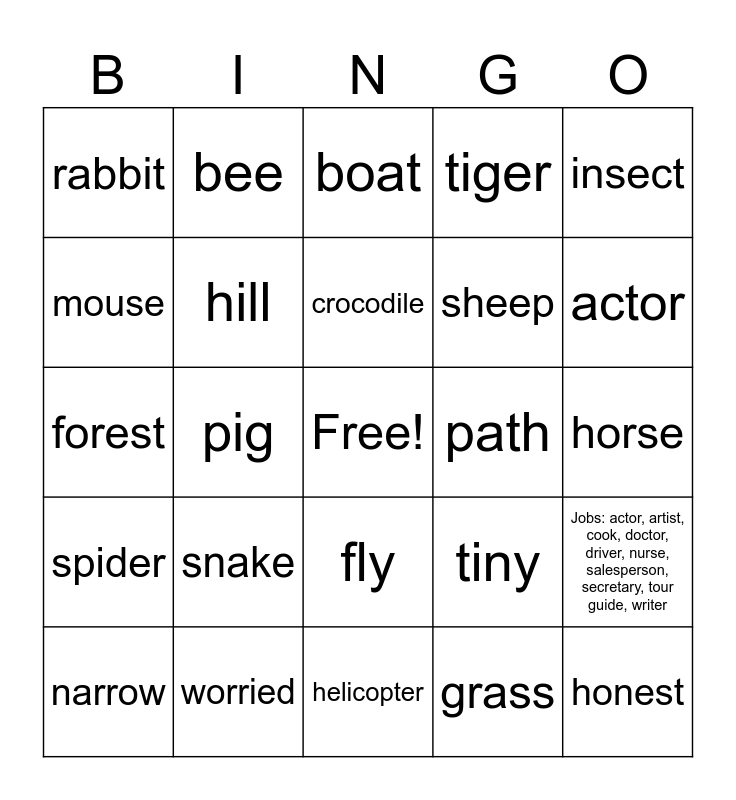 This bingo card has a free space and 66 words: Animals: amphibian, bee, butterfly, crocodile, duck, fly, frog, horse, insect, mammal, mouse, pig, rabbit, reptile, sheep, snake, spider, tiger, whale, Adjectives: angry, calm, confident, frightened, honest, kind, narrow, pretty, sad, straight, tiny, worried, Nature: field, forest, grass, ground, hill, island, path, river, sky, tree, Jobs: actor, artist, cook, doctor, driver, nurse, salesperson, secretary, tour guide, writer, Transport: aeroplane, boat, car, helicopter, jeep, lorry, motorbike, ship, taxi, tram, amphibian, bee, butterfly, crocodile, duck, fly, frog, horse, insect, mammal, mouse, pig, rabbit, reptile, sheep, snake, spider, tiger, whale, angry, calm, confident, frightened, honest, kind, narrow, pretty, sad, straight, tiny, worried, field, forest, grass, ground, hill, island, path, river, sky, tree, actor, artist, cook, doctor, driver, nurse, salesperson, secretary, tour guide, writer, firefighter, aeroplane, boat, helicopter, jeep, lorry, motorbike, ship, taxi and tram.
