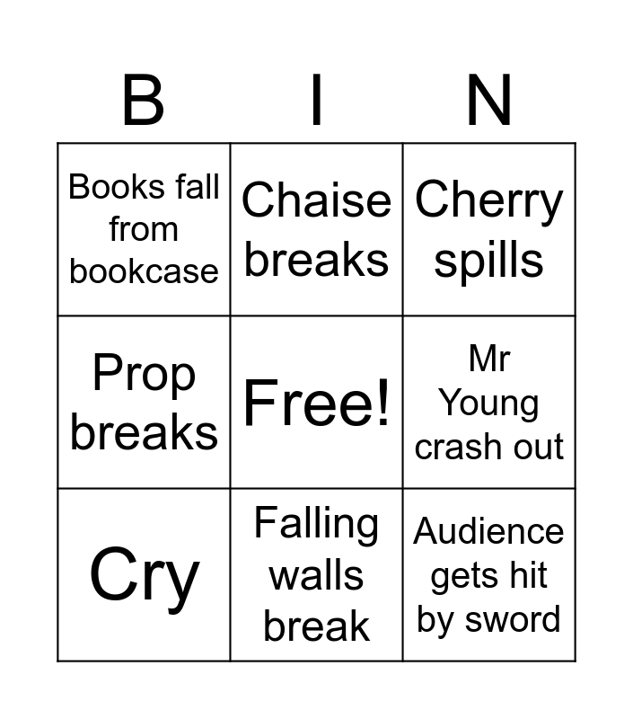 This bingo card has a free space and 8 words: Prop breaks, Chaise breaks, Mr Young crash out, Cry, Cherry spills, Books fall from bookcase, Falling walls break and Audience gets hit by sword.