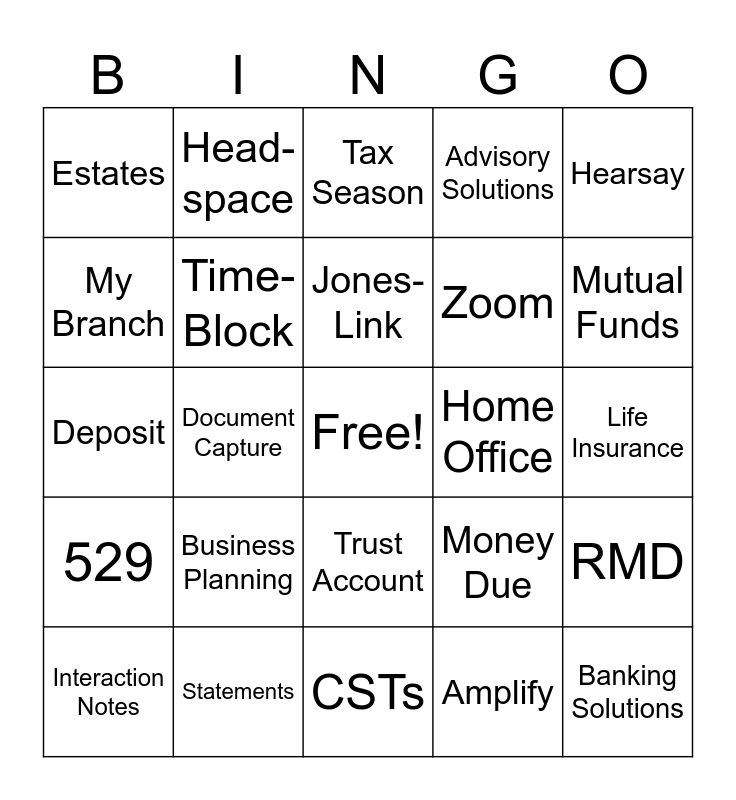 This bingo card has a free space and 52 words: Money Guide, Banking Solutions, Financial Planning, CSTs, Business Planning, Sales Force, Head- space, Webpage, My Branch, Word- Power, Time- Block, Rollover, RMD, Money Due, Ideal Client, Branch Team, Jones-Link, Home Office, FSPEND, Hearsay, Document Capture, Amplify, Estates, Zoom, Account Processing, EJ Pay, Estate File Manager, Goals Based Advice, Mutual Funds, Risk Tolerance, Forms Message, Advisory Solutions, Guided Solutions, Portfolio, Cost Basis, Tax Season, Statements, Callback, Appointment, Mutual Funds, Annuities, Life Insurance, 529, TOD, Trust Account, Roth IRA, POA, Deposit, JTWROS, CASH, Interaction Notes and Annual Review.